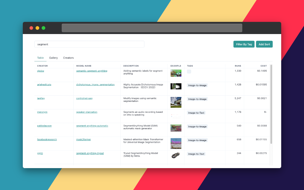 Replicate Codex is a fantastic resource for discovering AI models that cater to various creative needs, including image segmentation. It's a fully searchable, filterable, tagged database of all the models on Replicate, and also allows you to compare models and sort by price or explore by creator. It's free, and it also has a digest email that will alert you when new models come out so you can try them.