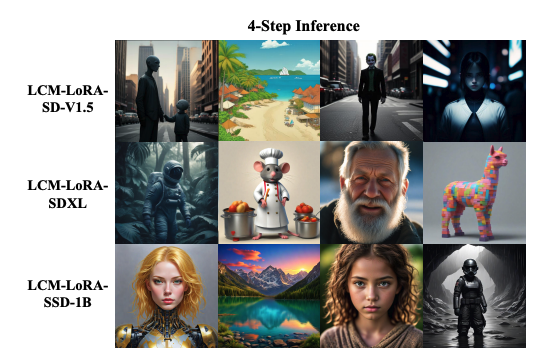 These models not only handle smaller images with ease but also excel in generating larger 1024x1024 images. They demonstrate an ability to scale to much larger neural network models than previously possible, showcasing their adaptability. The examples in the paper, such as those from the LCM-LoRA-SD-V1.5 and LCM-LoRA-SSD-1B versions, illustrate the model's broad applicability across various datasets and practical scenarios.