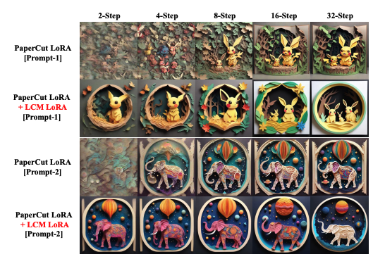 Figure 3 in the paper (shown below) illustrates the effectiveness of this approach by showing the results of specific style LoRA parameters combined with LCM-LoRA parameters. This demonstrates the model's ability to generate stylistically distinct images quickly and efficiently.