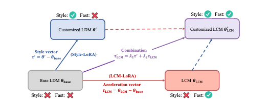 An interesting point here is the use of what they call the “acceleration vector” (τLCM) and the “style vector” (τ′), which are combined using specific mathematical formulas (λ1 and λ2 are adjustable factors in these formulas). This combination results in a model that can swiftly produce images in customized styles.