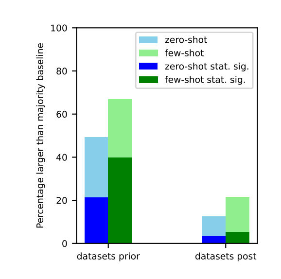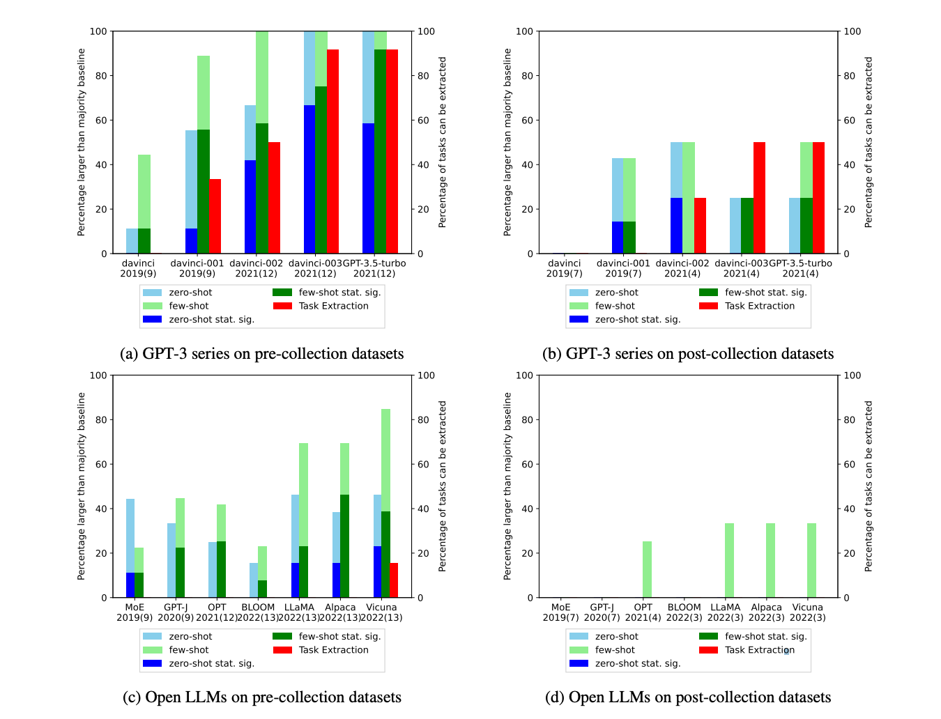 - LLMs were significantly more likely to beat simple majority class baselines on datasets created before their pre-training data was collected. This suggests many of those "pre-collection" tasks were contaminated.