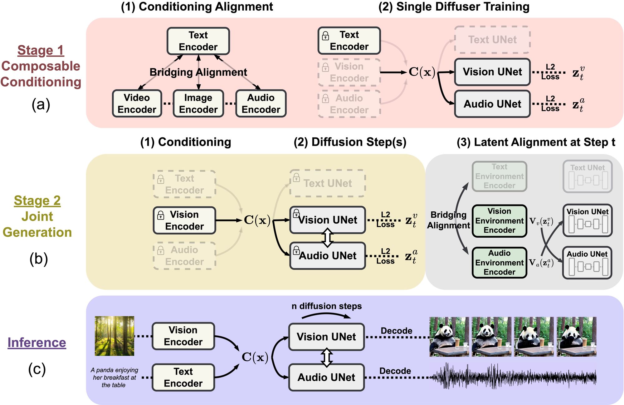 What's even cooler is that this is all made possible by a novel composable generation strategy, enabling synchronized generation of intertwined modalities. Imagine a video with perfectly synced audio, produced by a machine that's essentially just guessing how they fit together. It's like some kind of AI remix artist.